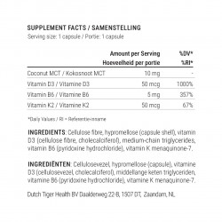 Other ingredients: Cellulose fibre, hypromellose (capsule shell), vitamin B6 (pyridoxine hydrochloride), vitamin D3 (cellulose fibre, cholecalciferol), medium-chain triglycerides, vitamin K2 MK7.